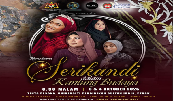 TANJUNG MALIM, 4 Oktober – Kisah empat tokoh wanita hebat dari Perak diangkat semula ke pentas melalui monodrama eksperimental ‘Serikandi dalam Kantung Budaya’, di Panggung Tinta Pesona, Universiti Pendidikan Sultan Idris (UPSI) malam tadi (Jumaat).