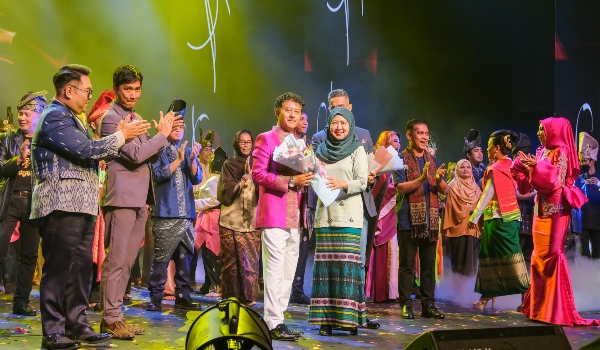 (Ketua Pengarah Istana Budaya,Zubaidah Mukhtar menyerahkan bunga penghargaan kepada Konduktor, Pengarah Muzik OTM Mohd Yazid Zakaria/FOTO Istana Budaya)