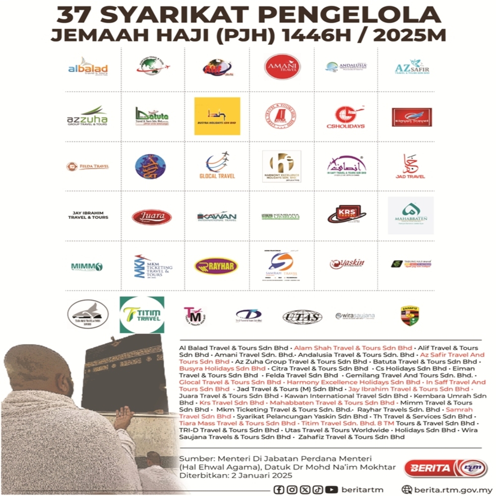 Utama Infografik 37 SENARAI PENGELOLA JEMAAH HAJI (PJH) 1446H / 2025M 37 SENARAI PENGELOLA JEMAAH HAJI (PJH) 1446H / 2025M2/01/2025 | 4:44 pmInfografik Kongsi berita Share on X (Twitter) Share on Facebook Share on WhatsApp Share on Telegram Berita sebelumnyaSPRM kesan tujuh individu, terbabit kes tuntutan palsuBerita seterusnyaMelindungi dompet rakyat: Era baharu pembiayaan peribadi di Malaysia PALING POPULAR Test berita palsu PRN DUN SABAH TEST 534 Sukan