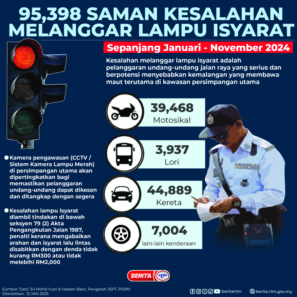 Utama Infografik 95,398 SAMAN KESALAHAN MELANGGAR LAMPU ISYARAT (SEPANJANG JANUARI – NOVEMBER 2024) 95,398 SAMAN KESALAHAN MELANGGAR LAMPU ISYARAT (SEPANJANG JANUARI – NOVEMBER 2024)12/01/2025 | 8:55 pmInfografik Kongsi berita Share on X (Twitter) Share on Facebook Share on WhatsApp Share on Telegram Berita sebelumnyaPesawat A330neo: Rekaan batik eksklusif serlahkan identiti MalaysiaBerita seterusnyaLawatan PM ke UAE manfaatkan kapasiti Pengerusi ASEAN 2025 PALING POPULAR Test Dunia Test Dunia
