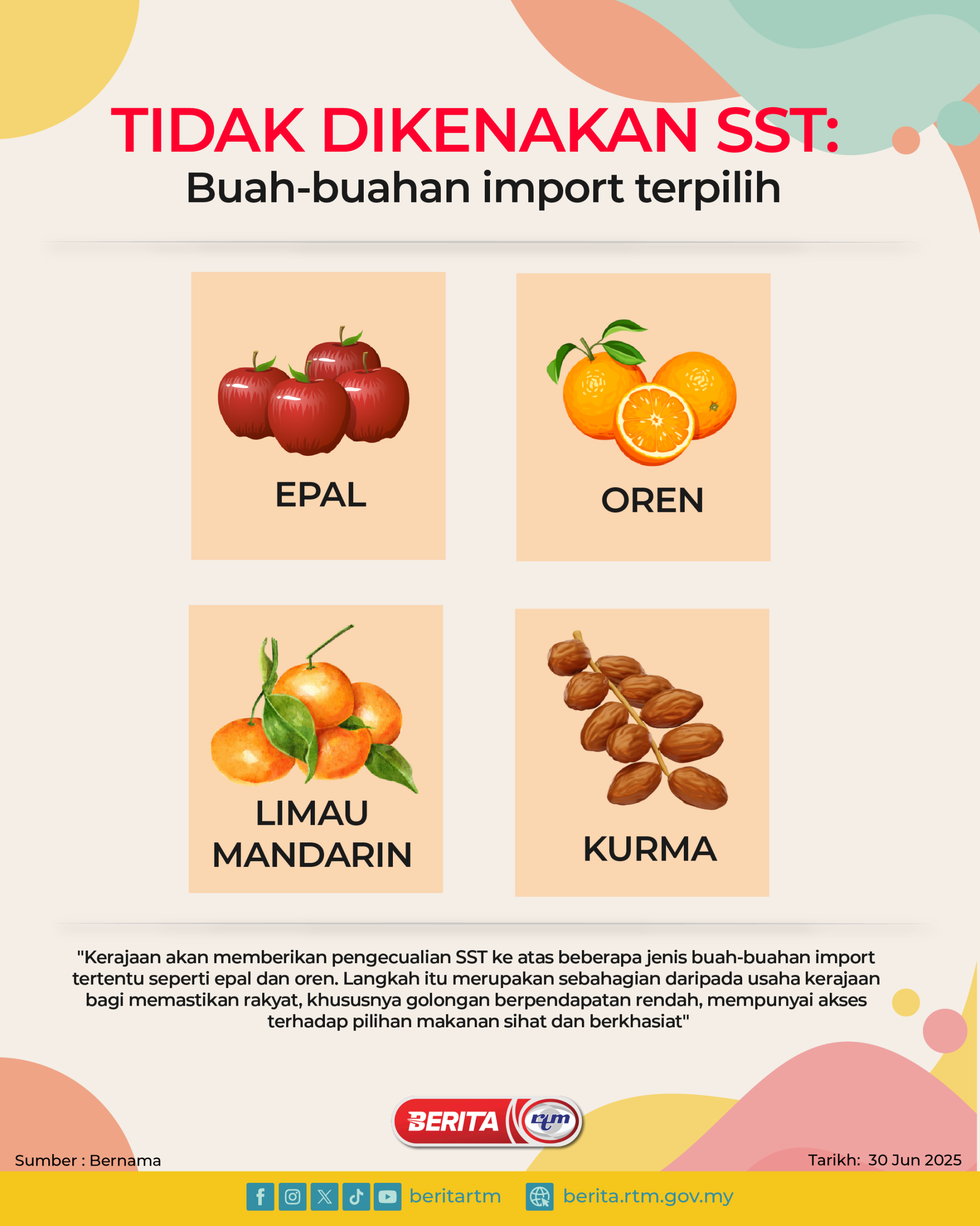 Utama Infografik BUAH-BUAHAN IMPORT DIKECUALIKAN SST BUAH-BUAHAN IMPORT DIKECUALIKAN SST30/06/2025 | 1:23 pmInfografik Kongsi berita Share on X (Twitter) Share on Facebook Share on WhatsApp Share on Telegram Berita sebelumnyaBayar tunai – tanpa tunai, mana lebih selamat dan praktikal?Berita seterusnyaPGA Sarawak rampas kayu balak, arak, diesel & dadah bernilai ... PALING POPULAR Test Dunia Test Dunia
