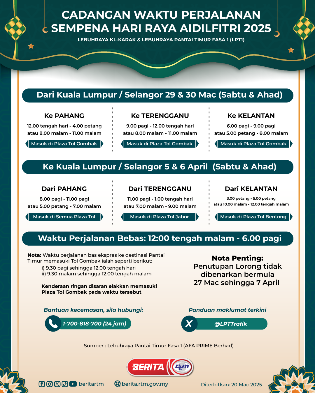 Utama Infografik CADANGAN WAKTU PERJALANAN SEMPENA HARI RAYA AIDILFITRI 2025 CADANGAN WAKTU PERJALANAN SEMPENA HARI RAYA AIDILFITRI 202520/03/2025 | 10:55 amInfografik Kongsi berita Share on X (Twitter) Share on Facebook Share on WhatsApp Share on Telegram Berita sebelumnyaPembangunan sumber baharu, kerajaan komited lonjak ekonomi negaraBerita seterusnyaDBKL jadi pemudah cara, pastikan urusan perpindahan kuil diselesai dengan ... PALING POPULAR Test Dunia Test Dunia