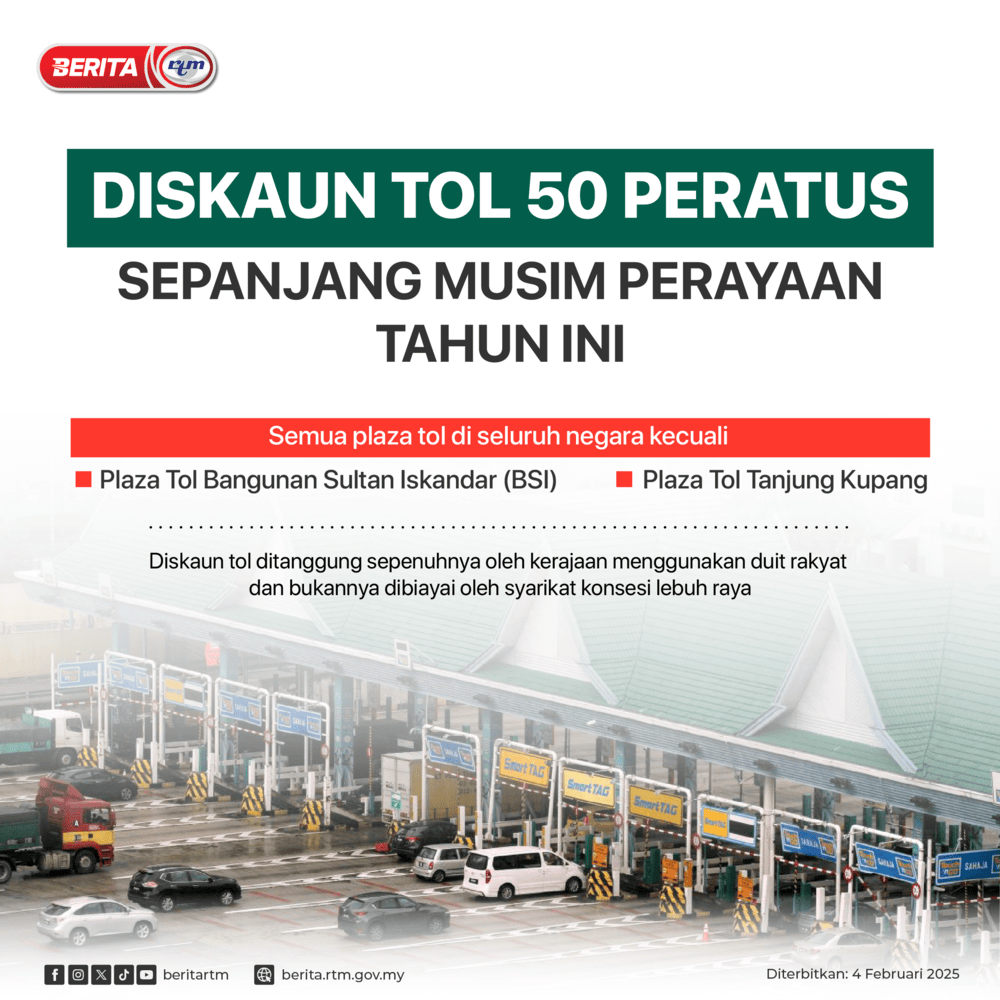 Utama Infografik DISKAUN TOL 50 PERATUS SEPANJANG MUSIM PERAYAAN TAHUN INI DISKAUN TOL 50 PERATUS SEPANJANG MUSIM PERAYAAN TAHUN INI4/02/2025 | 9:36 pmInfografik Kongsi berita Share on X (Twitter) Share on Facebook Share on WhatsApp Share on Telegram Berita sebelumnyaTAMBANG PERCUMA PENUMPANG KTM KOMUTER LEMBAH KLANG SELAMA DUA HARI ...Berita seterusnyaProjek ECRL capai kemajuan 78.5 peratus setakat Januari PALING POPULAR Test berita palsu PRN DUN SABAH TEST 534 Sukan