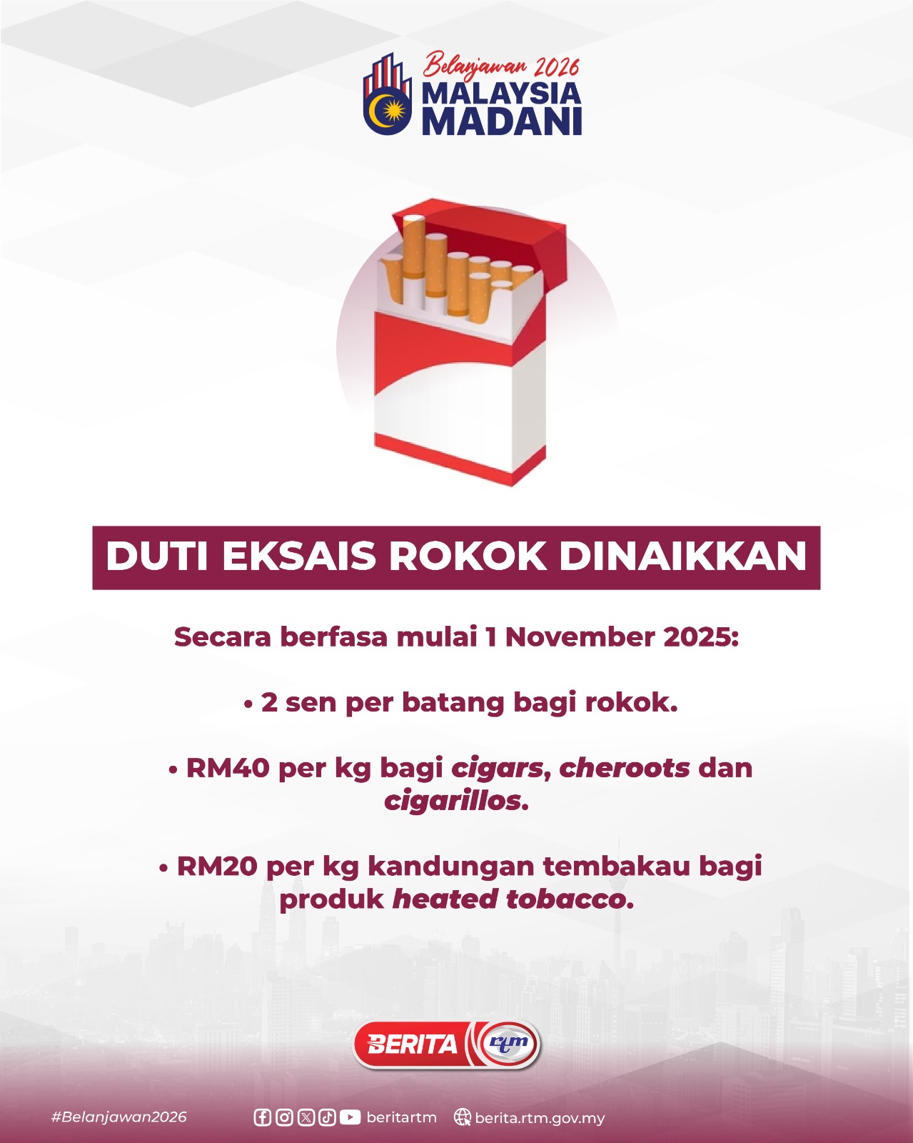 Utama Infografik DUTI EKSAIS ROKOK DINAIKKAN DUTI EKSAIS ROKOK DINAIKKAN10/10/2025 | 7:59 pmInfografik Kongsi berita Share on X (Twitter) Share on Facebook Share on WhatsApp Share on Telegram Berita sebelumnyaKerajaan naikkan peruntukan TVET kepada RM7.9 Bilion, perkukuh pembangunan bakat ...Berita seterusnyaNETR sasar 70 peratus kapasiti penjanaan elektrik daripada sumber TBB PALING POPULAR Test berita palsu PRN DUN SABAH TEST 534 Sukan