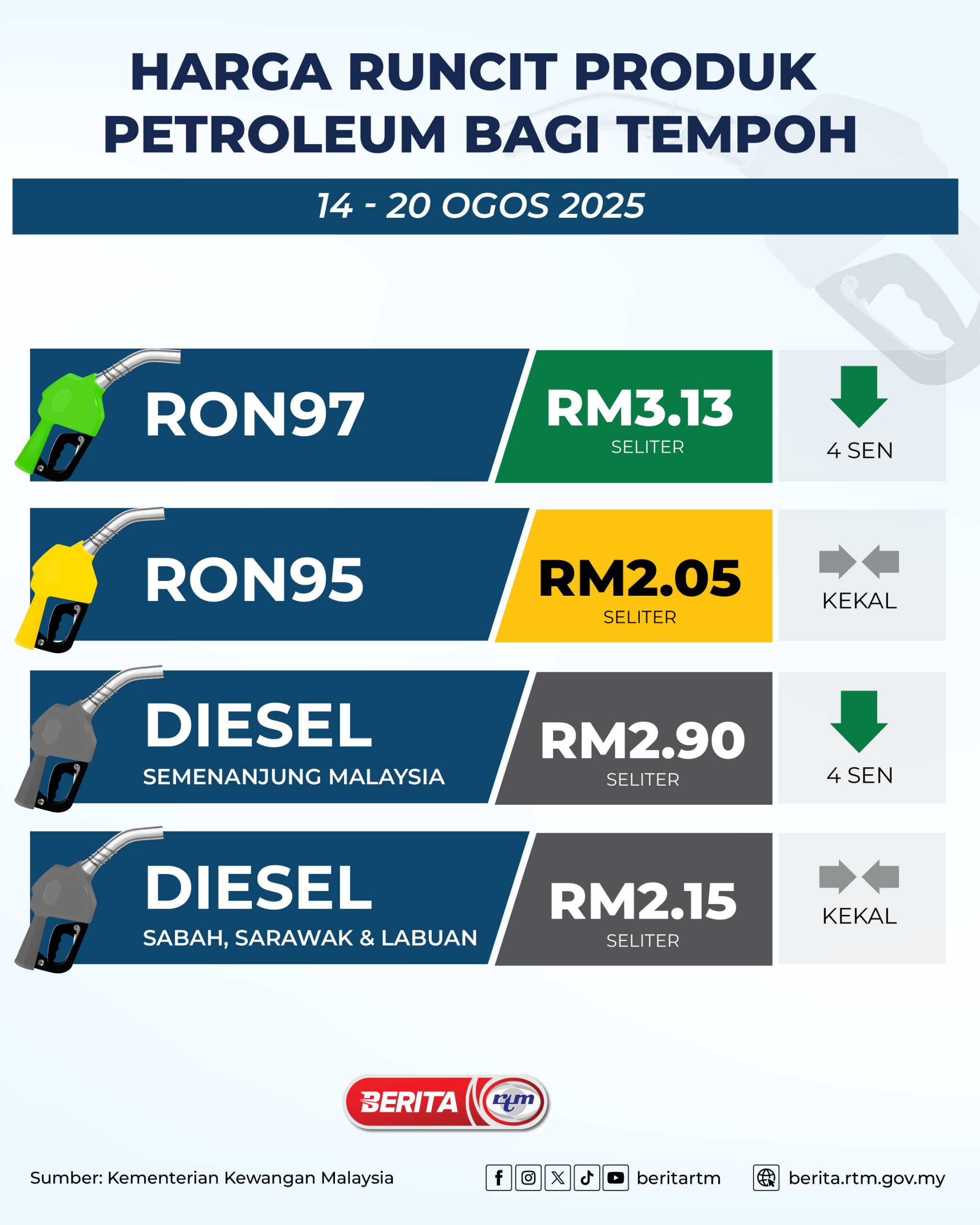 Utama Infografik Harga runcit produk petroleum bagi tempoh 14 – 20 ogos 2025. Harga runcit produk petroleum bagi tempoh 14 – 20 ogos 2025.13/08/2025 | 9:48 pmInfografik Kongsi berita Share on X (Twitter) Share on Facebook Share on WhatsApp Share on Telegram Berita sebelumnyaWatanabe unggul, Crouin kekal juara skuasy Sukan DuniaBerita seterusnyaLelaki ditahan, seludup petrol ke tapak pembinaan gagal PALING POPULAR Test Dunia Test Dunia