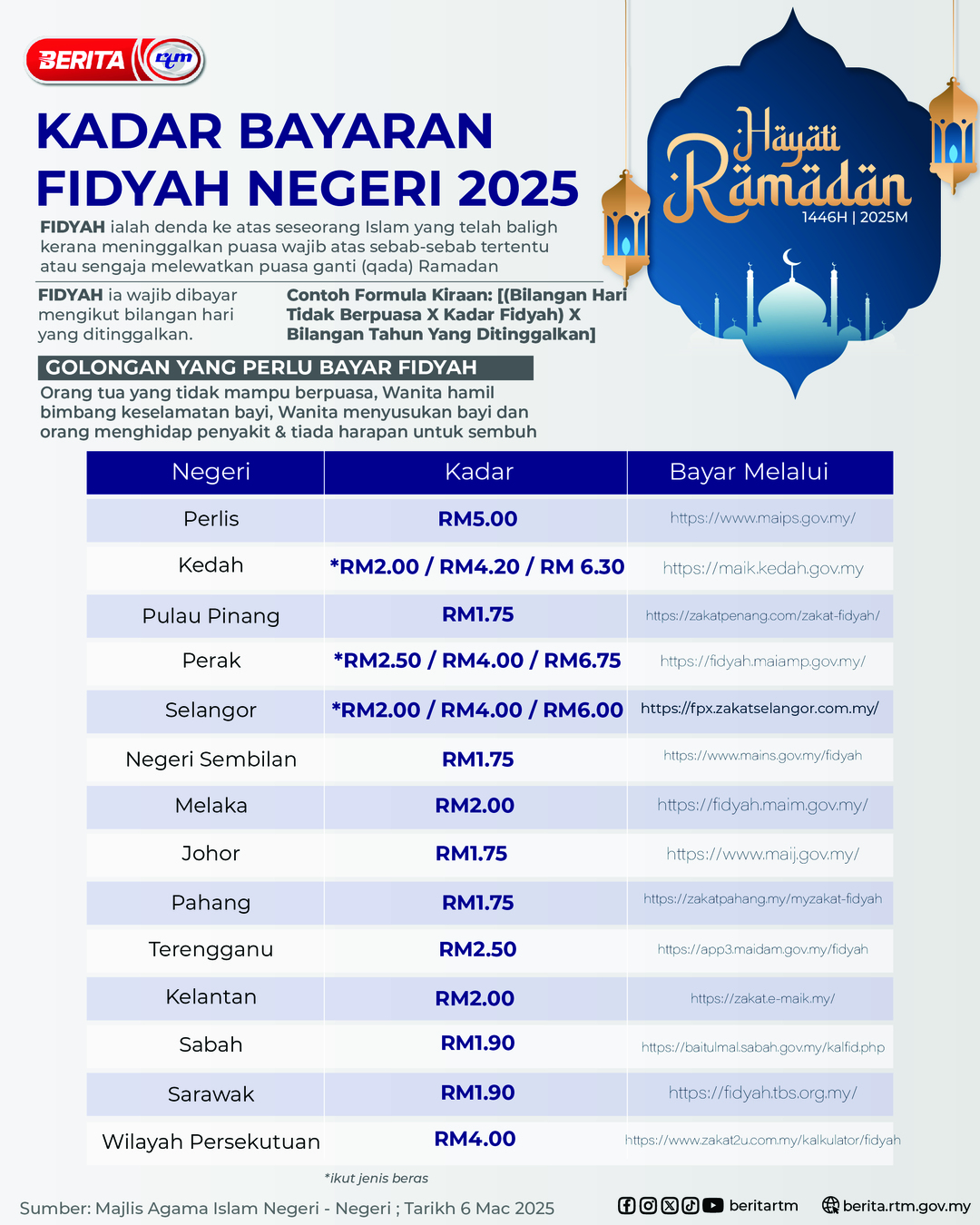 Utama Infografik KADAR BAYARAN FIDYAH MENGIKUT NEGERI TAHUN 2025 KADAR BAYARAN FIDYAH MENGIKUT NEGERI TAHUN 20256/03/2025 | 8:19 pmInfografik Kongsi berita Share on X (Twitter) Share on Facebook Share on WhatsApp Share on Telegram Berita sebelumnyaOP Pantau 2025: KPDN Perak perketat penguatkuasaanBerita seterusnyaRINGKASAN PERNYATAAN DASAR MONETARI (MPS) MAC 2025 PALING POPULAR Test Dunia Test Dunia