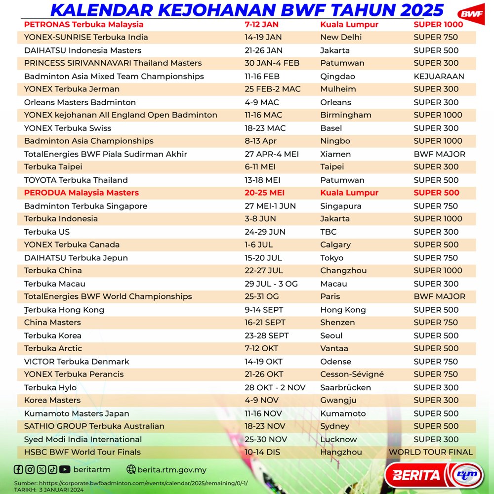 Utama Infografik KALENDAR KEJOHANAN BWF TAHUN 2025 KALENDAR KEJOHANAN BWF TAHUN 20256/01/2025 | 7:54 amInfografik Kongsi berita Share on X (Twitter) Share on Facebook Share on WhatsApp Share on Telegram Berita sebelumnyaTamu mingguan ‘Gaya Street’ tarik pengunjung tempatan, asingBerita seterusnyaVietnam juara Piala Asean 2024 PALING POPULAR Test berita palsu PRN DUN SABAH TEST 534 Sukan