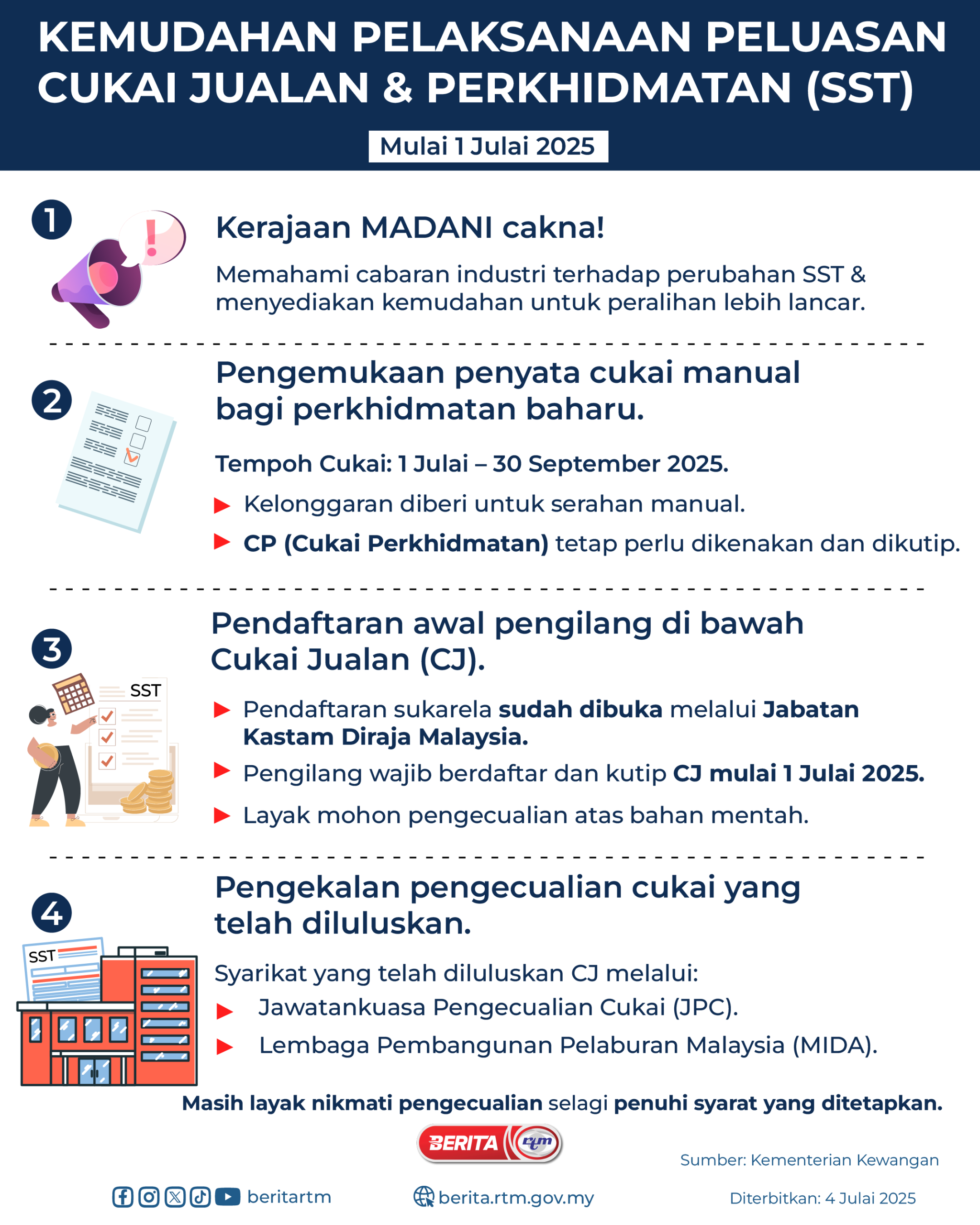 Utama Infografik Kemudahan Pelaksanaan Peluasan Cukai Jualan & Perkhidmatan (SST). Kemudahan Pelaksanaan Peluasan Cukai Jualan & Perkhidmatan (SST).4/07/2025 | 7:38 pmInfografik Kongsi berita Share on X (Twitter) Share on Facebook Share on WhatsApp Share on Telegram Berita sebelumnyaNiaga hadapan KLIBOR ditutup tidak diniagakanBerita seterusnyaJambatan baharu hubungkan Pulau Tuba dengan Pulau Dayang Bunting PALING POPULAR Test Dunia Test Dunia