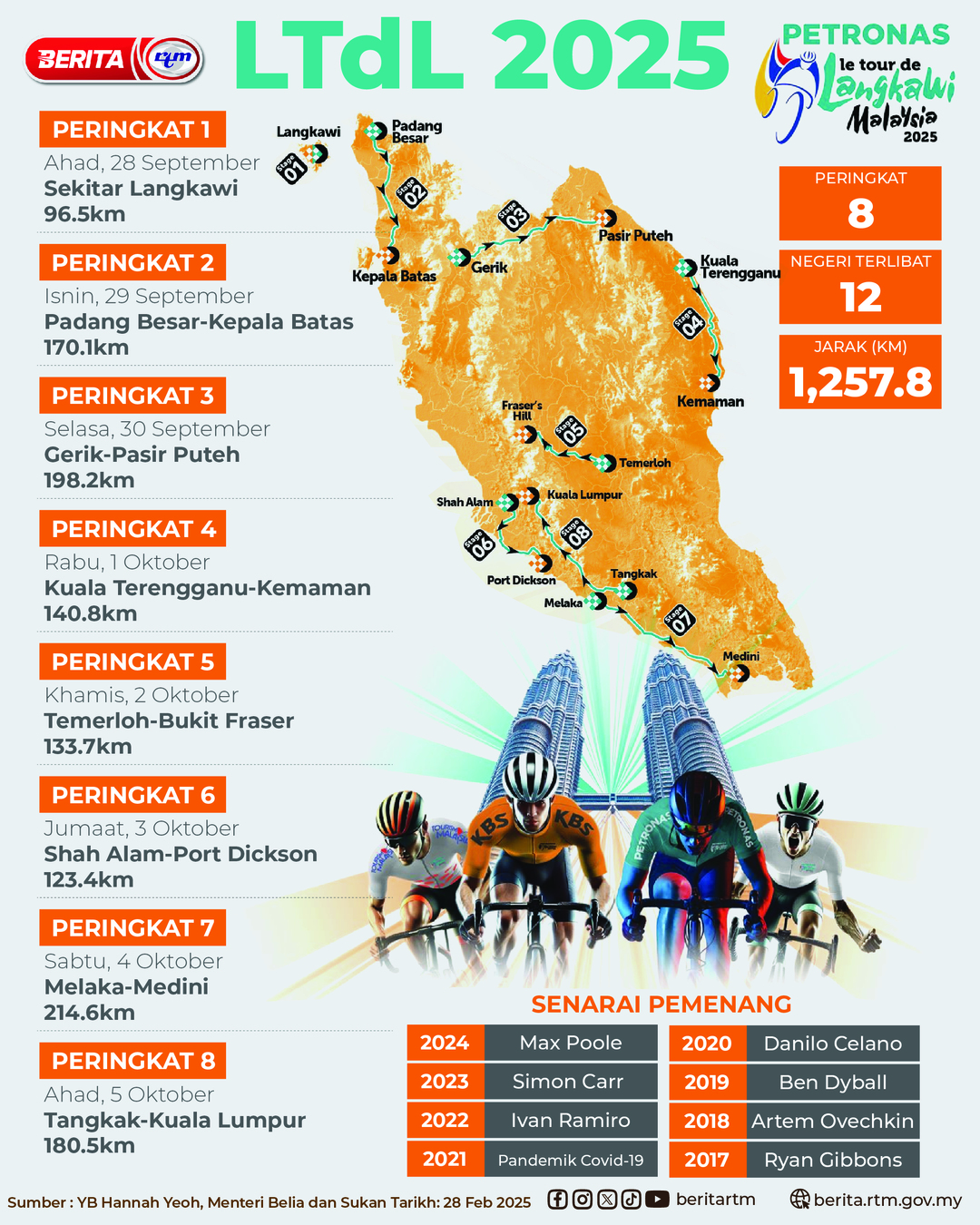 Utama Infografik LALUAN DAN JADUAL PERLUMBAAN BAGI LE TOUR DE LANGKAWI 2025 LALUAN DAN JADUAL PERLUMBAAN BAGI LE TOUR DE LANGKAWI 202528/02/2025 | 3:30 pmInfografik Kongsi berita Share on X (Twitter) Share on Facebook Share on WhatsApp Share on Telegram Berita sebelumnyaRANG UNDANG-UNDANG (RUU) MAJLIS MEDIA MALAYSIA (MMM) 2024 DILULUSKAN DEWAN ...Berita seterusnyaSELAMAT MENYAMBUT ULANG TAHUN HARI TENTERA DARAT KE-92 PALING POPULAR Test Dunia Test Dunia