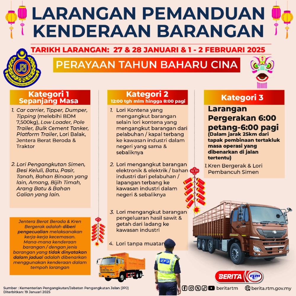 Utama Infografik LARANGAN PEMANDUAN KENDERAAN BARANGAN (ROAD BAN) SEMPENA PERAYAAN TAHUN BARU CINA 2025 LARANGAN PEMANDUAN KENDERAAN BARANGAN (ROAD BAN) SEMPENA PERAYAAN TAHUN BARU CINA 202519/01/2025 | 5:28 pmInfografik Kongsi berita Share on X (Twitter) Share on Facebook Share on WhatsApp Share on Telegram Berita sebelumnyaHamas kemuka tiga nama tahanan wanita IsraelBerita seterusnyaMelaka sasar perluas jaringan industri, sedia peluang kerjaya untuk belia PALING POPULAR Test Dunia Test Dunia