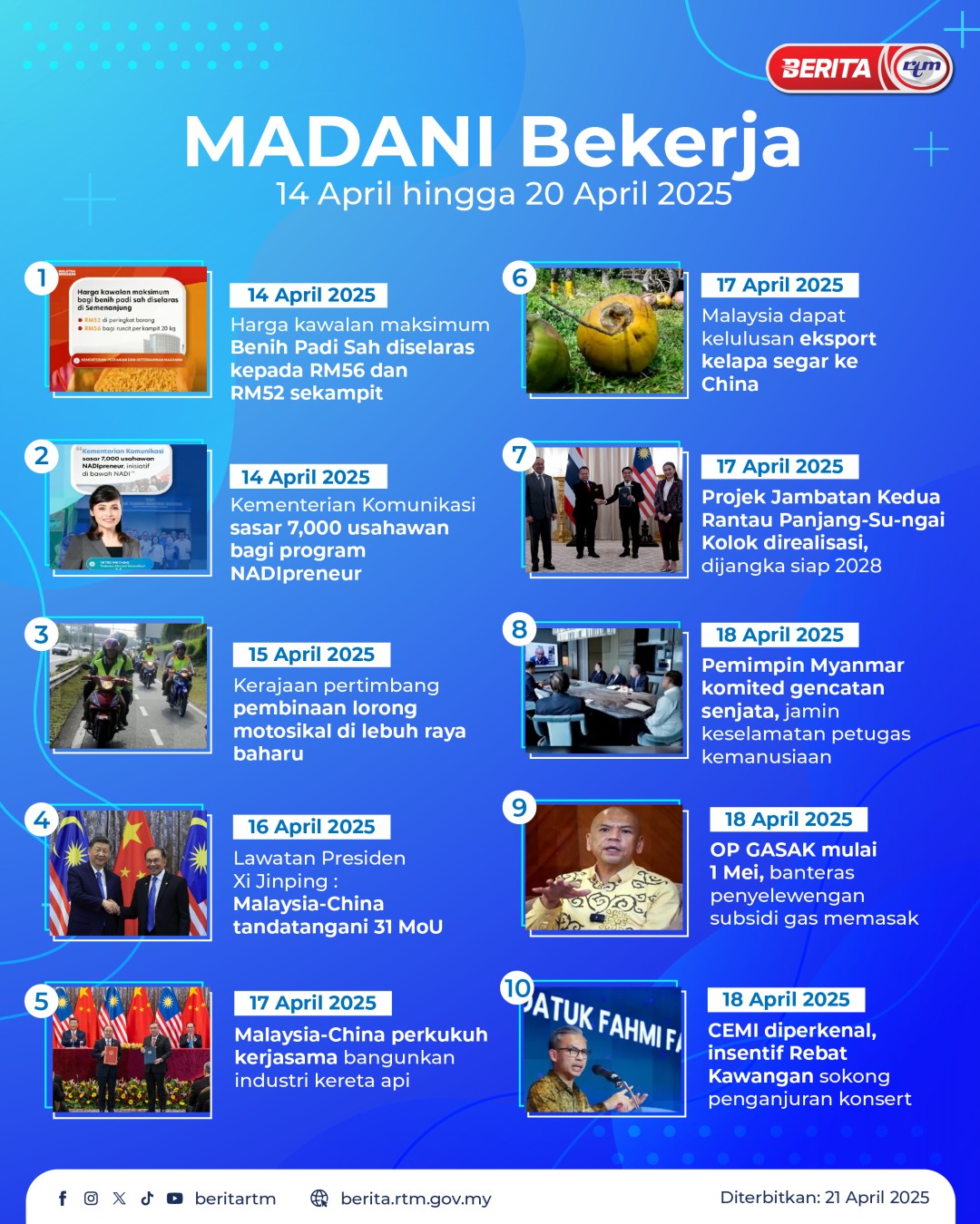 Utama Infografik MADANI BEKERJA 14 APRIL HINGGA 20 APRIL 2025 MADANI BEKERJA 14 APRIL HINGGA 20 APRIL 202521/04/2025 | 6:30 pmInfografik Kongsi berita Share on X (Twitter) Share on Facebook Share on WhatsApp Share on Telegram Berita sebelumnyaBN, PH elak ceramah besar, pilih strategi bersasarBerita seterusnyaMalaysia anjur Forum Koperasi ASEAN Mei depan PALING POPULAR Test berita palsu PRN DUN SABAH TEST 534 Sukan