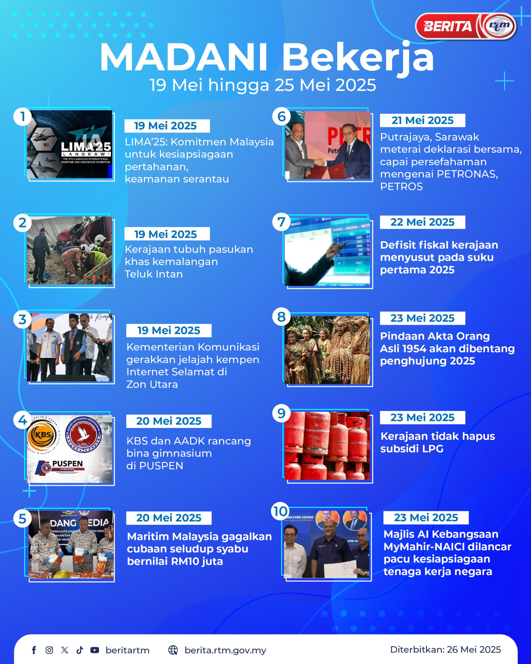 Utama Infografik MADANI BEKERJA 19 MEI HINGGA 25 MEI 2025 MADANI BEKERJA 19 MEI HINGGA 25 MEI 202526/05/2025 | 8:15 amInfografik Kongsi berita Share on X (Twitter) Share on Facebook Share on WhatsApp Share on Telegram Berita sebelumnyaTarif 50% ke atas EU ditangguh hingga 9 Julai- TrumpBerita seterusnyaDasar ketat imigresen AS jejas pelajar antarabangsa, institusi pendidikan tinggi PALING POPULAR Test Dunia Test Dunia
