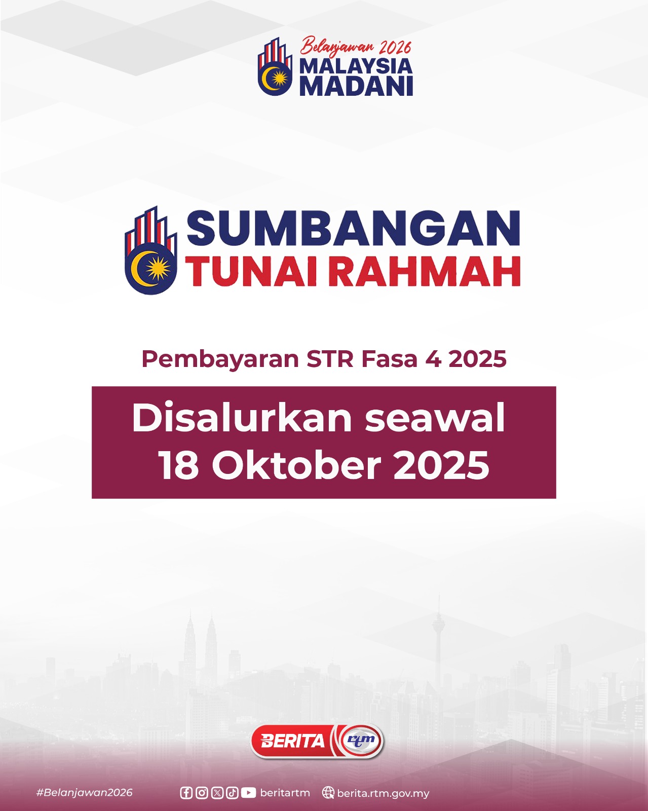 Utama Infografik PEMBAYARAN STR FASA 4 2025 PEMBAYARAN STR FASA 4 202510/10/2025 | 5:44 pmInfografik Kongsi berita Share on X (Twitter) Share on Facebook Share on WhatsApp Share on Telegram Berita sebelumnyaHad umur belia ditetapkan 15 hingga 30 tahun, bermula tahun ...Berita seterusnyaLebih RM700 juta perkukuh aset, latihan badan penguat kuasa PALING POPULAR Test berita palsu PRN DUN SABAH TEST 534 Sukan