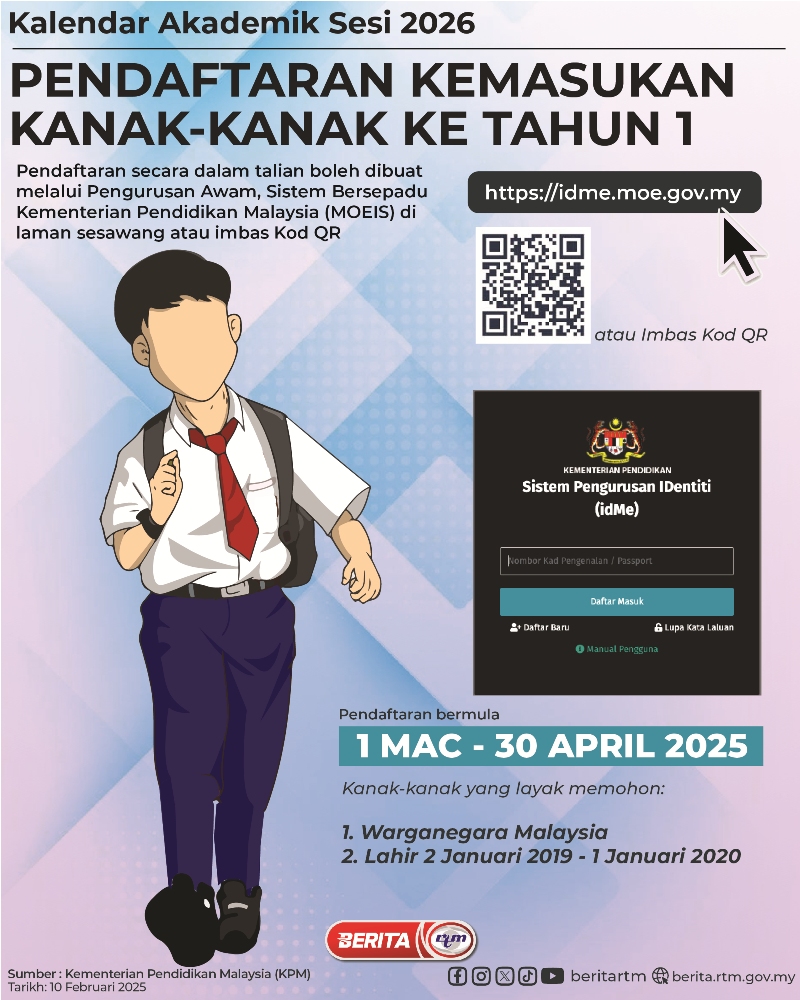 Utama Infografik PENDAFTARAN TAHUN 1 KALENDAR AKADEMIK SESI 2026. PENDAFTARAN MULAI 1 MAC HINGGA 30 APRIL 2025 PENDAFTARAN TAHUN 1 KALENDAR AKADEMIK SESI 2026. PENDAFTARAN MULAI 1 MAC HINGGA 30 APRIL 202510/02/2025 | 3:04 pmInfografik Kongsi berita Share on X (Twitter) Share on Facebook Share on WhatsApp Share on Telegram Berita sebelumnyaDasar Kerajaan MADANI antara dibincang pemikir ‘Atlantic Council’Berita seterusnya???? ???????? ???? ???? ?? ?????? ???? ??????? ????? ???? ... PALING POPULAR Test Dunia Test Dunia