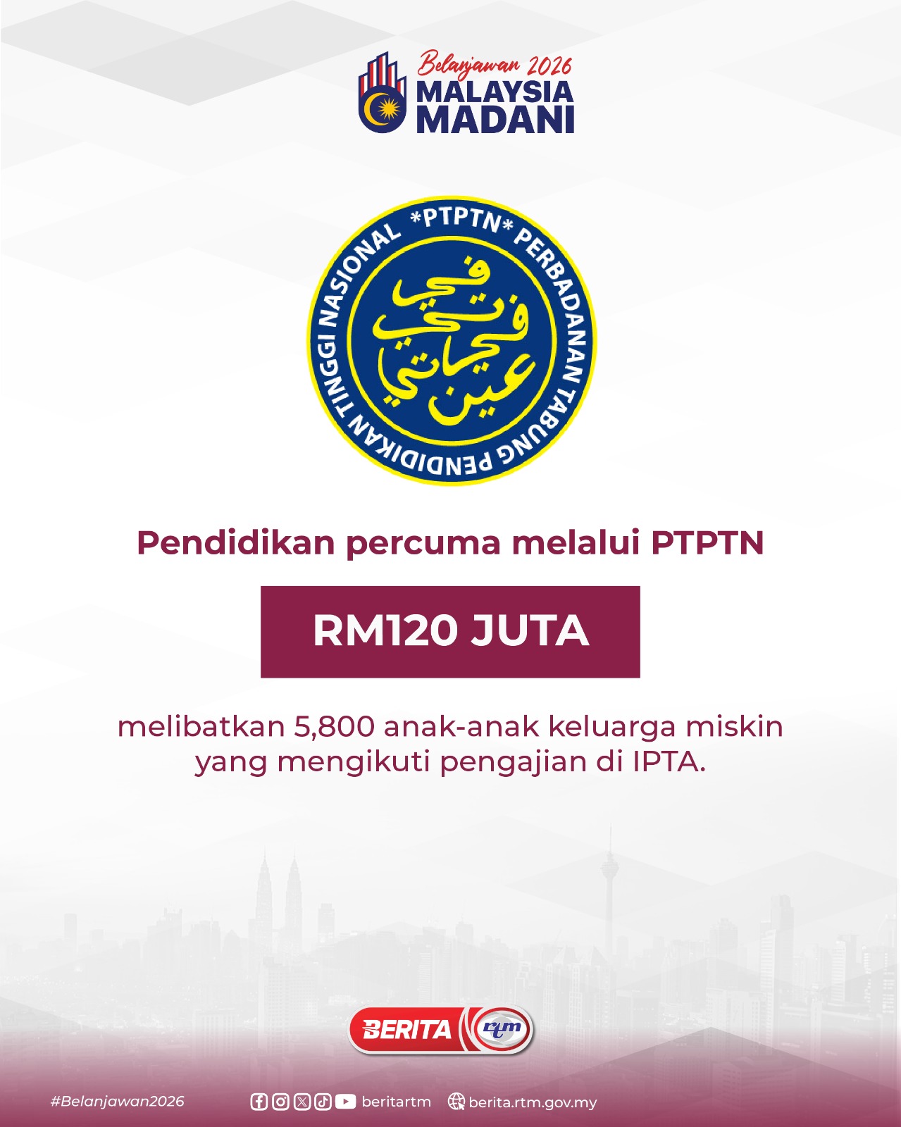 Utama Infografik PENDIDIKAN PERCUMA MELALUI PTPTN PENDIDIKAN PERCUMA MELALUI PTPTN10/10/2025 | 6:30 pmInfografik Kongsi berita Share on X (Twitter) Share on Facebook Share on WhatsApp Share on Telegram Berita sebelumnyaGLIC pacu pelaburan domestik, meningkat RM30 bilionBerita seterusnyaBelanjawan 2026: Kerajaan komited lerai isu sesak di hospital awam PALING POPULAR Test berita palsu PRN DUN SABAH TEST 534 Sukan