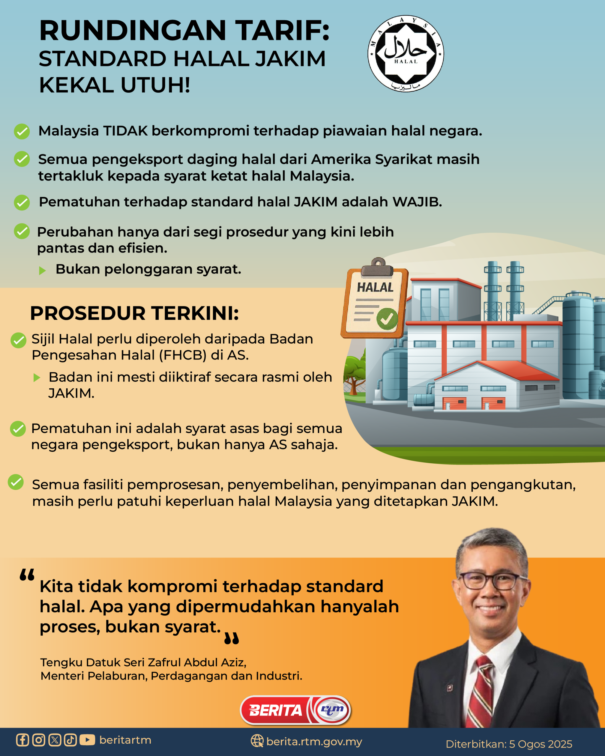 Utama Infografik RUNDINGAN TARIF: STANDARD HALAL JAKIM KEKAL UTUH! RUNDINGAN TARIF: STANDARD HALAL JAKIM KEKAL UTUH!5/08/2025 | 8:27 pmInfografik Kongsi berita Share on X (Twitter) Share on Facebook Share on WhatsApp Share on Telegram Berita sebelumnyaKBS muktamadkan empat sukan tambahan SUKMA Selangor 2026Berita seterusnyaPelaburan pembangunan biodiversiti bandar beri pulangan berganda PALING POPULAR Test Dunia Test Dunia