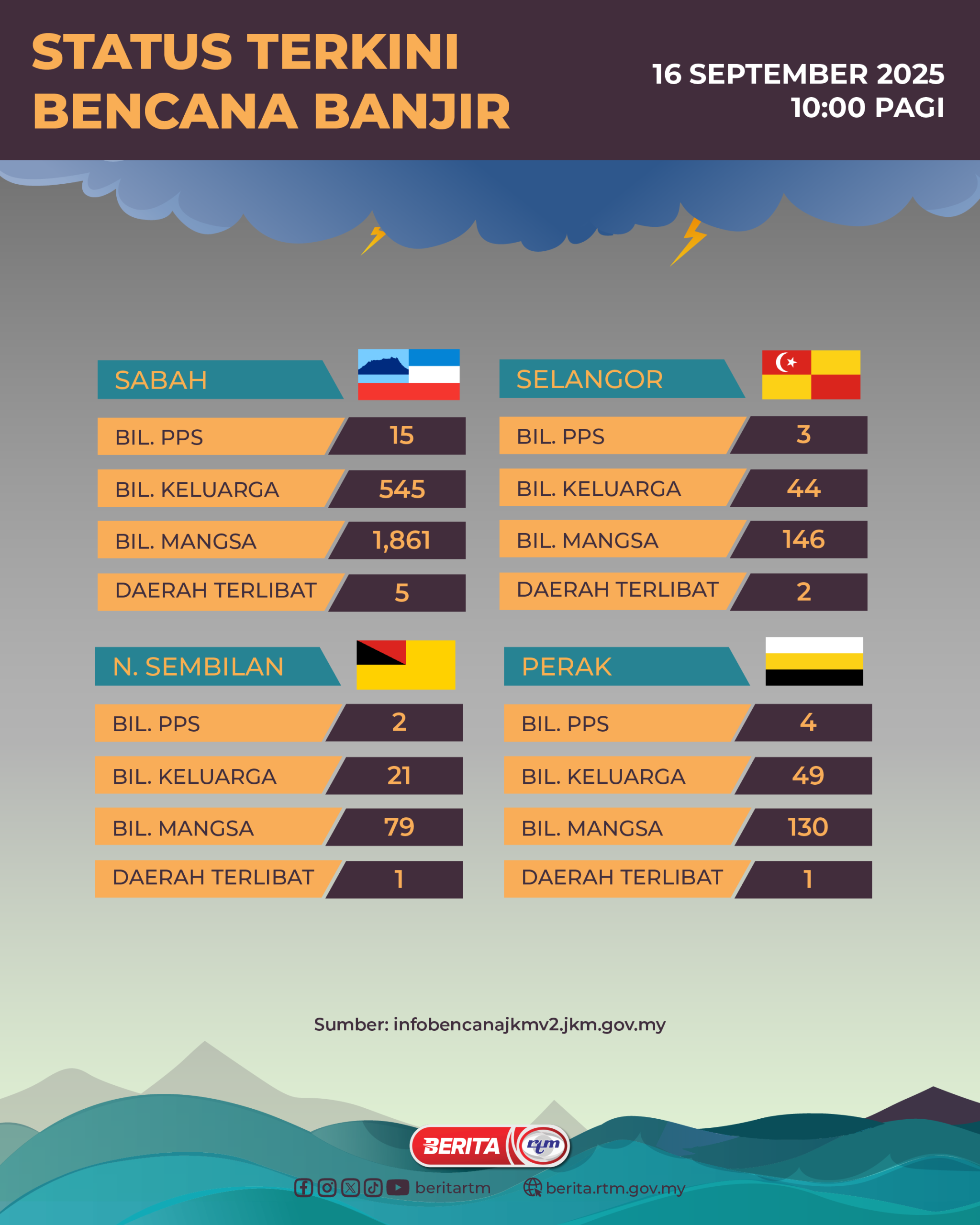 Utama Infografik STATUS TERKINI BENCANA BANJIR 16 SEPTEMBER 2025 | 10:00 PAGI STATUS TERKINI BENCANA BANJIR 16 SEPTEMBER 2025 | 10:00 PAGI16/09/2025 | 10:40 amInfografik Kongsi berita Share on X (Twitter) Share on Facebook Share on WhatsApp Share on Telegram Berita sebelumnyaArteta yakin skuad mantap Arsenal mampu tembusi sejarah UCLBerita seterusnyaPolis terima lima laporan polis terhadap UMANY PALING POPULAR Test Dunia Test Dunia