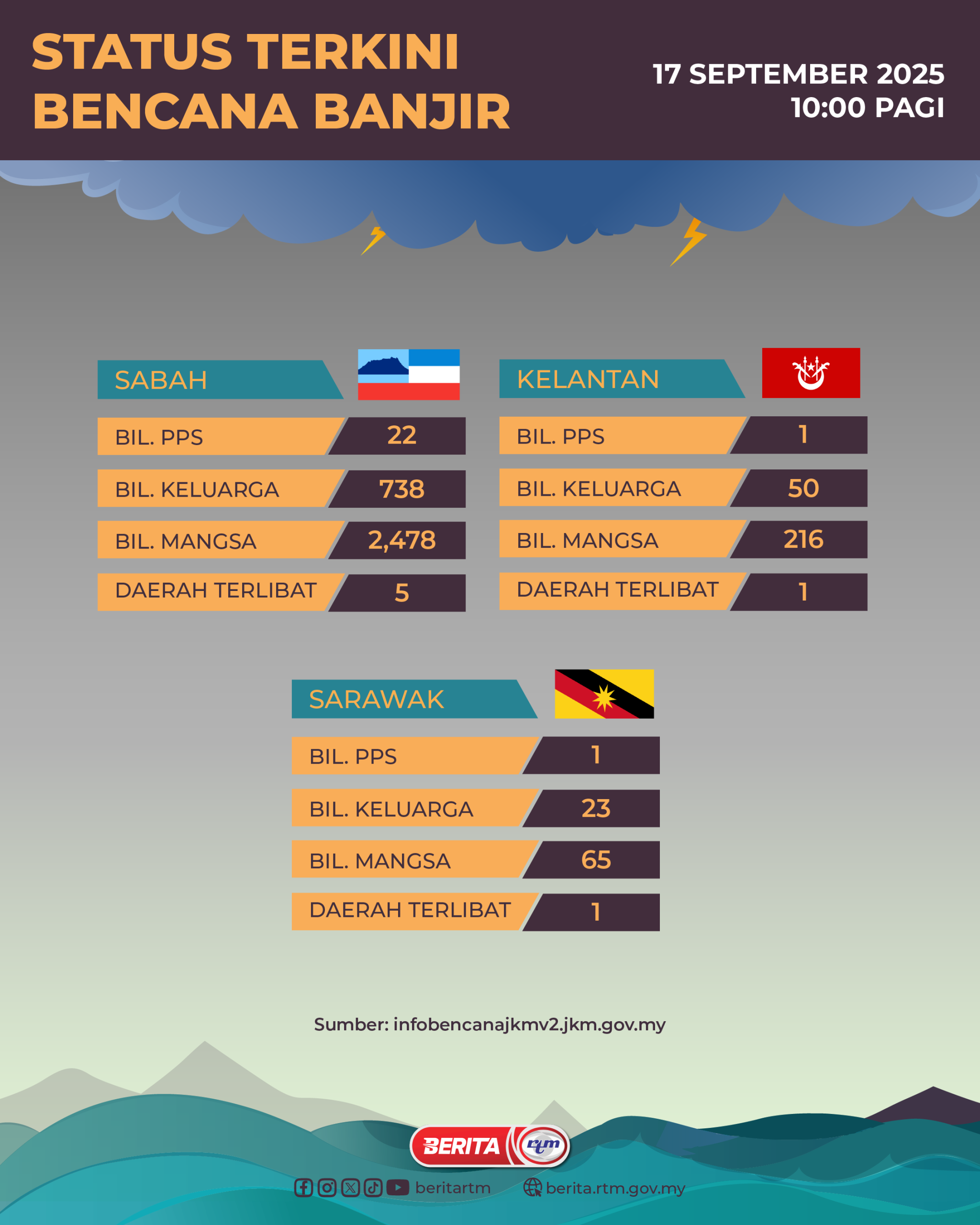 Utama Infografik STATUS TERKINI BENCANA BANJIR 17 SEPTEMBER 2025 | 10.00 PAGI STATUS TERKINI BENCANA BANJIR 17 SEPTEMBER 2025 | 10.00 PAGI17/09/2025 | 10:37 amInfografik Kongsi berita Share on X (Twitter) Share on Facebook Share on WhatsApp Share on Telegram Berita sebelumnyaBursa Malaysia meningkat, menjelang keputusan kadar faedah ASBerita seterusnyaPulau Pugad tenggelam akibat penurunan tanah, peningkatan paras laut PALING POPULAR Test berita palsu PRN DUN SABAH TEST 534 Sukan