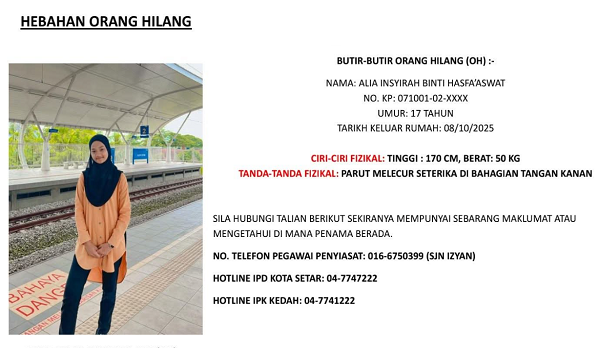 ALOR SETAR, 11 Ogos – Polis sedang mengesan seorang remaja perempuan, Alia Insyirah Hasfa’aswat, 17 tahun, yang dilaporkan hilang sejak semalam.
