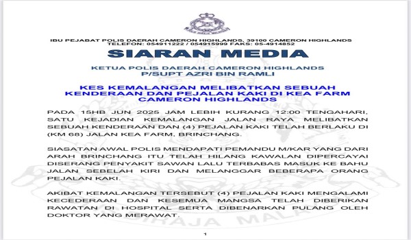 Beliau berkata siasatan awal mendapati kemalangan kira-kira 12 tengah hari itu berlaku ketika kereta jenis Perodua Myvi dipandu seorang lelaki berusia 22 tahun, dalam perjalanan dari arah Brinchang.