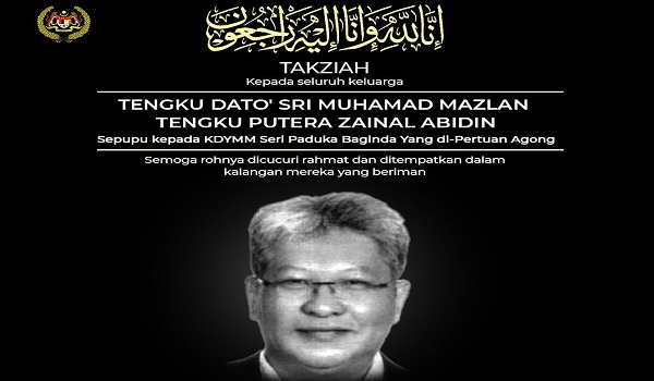 KUALA LUMPUR, 28 Ogos– Yang di-Pertuan Agong, Al-Sultan Abdullah Ri’ayatuddin Al-Mustafa Billah Shah menzahirkan ucapan takziah kepada seluruh keluarga Tengku Datuk Seri Muhamad Mazlan Tengku Putera Zainal Abidin, sepupu kepada KDYMM Seri Paduka Baginda Yang di-Pertuan Agong yang telah kembali ke Rahmatullah hari ini.