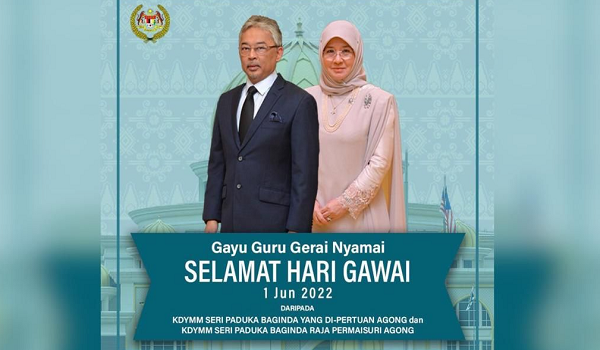 KUALA LUMPUR, 1 Jun– Yang di-Pertuan Agong Al-Sultan Abdullah Ri’ayatuddin Al-Mustafa Billah Shah dan Raja Permaisuri Agong Tunku Hajah Azizah Aminah Maimunah Iskandariah, menzahirkan ucapan selamat menyambut Hari Gawai kepada semua yang meraikan perayaan itu di Sarawak hari ini.