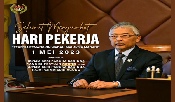 KUALA LUMPUR, 1 Mei – Yang di-Pertuan Agong Al-Sultan Abdullah Ri’ayatuddin Al-Mustafa Billah Shah menzahirkan ucapan Selamat Hari Pekerja sempena sambutan itu hari ini.
