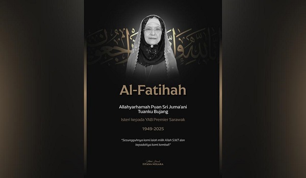 KUALA LUMPUR, 23 Jun– Yang di-Pertuan Agong, Sultan Ibrahim menzahirkan ucapan takziah atas pemergian isteri kepada Premier Sarawak, Tan Sri Abang Johari Abang Openg iaitu Puan Sri Juma’ani Tuanku Bujang.