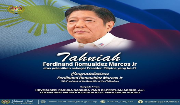 “Dalam merakamkan ucapan tahniah, Seri Paduka juga telah berkenan mengutus warkah ucapan tahniah peribadi kepada Ferdinand Romualdez Marcos Jr kelmarin.