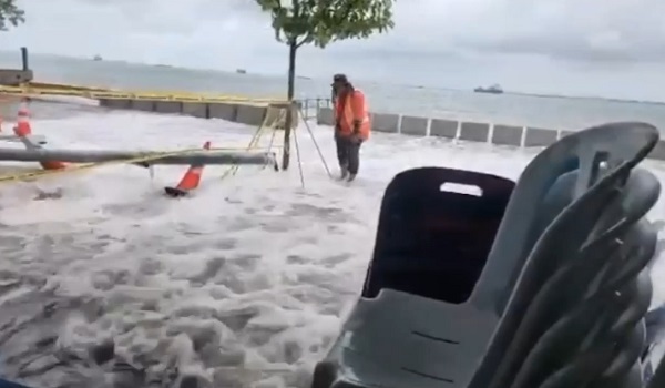 GEORGE TOWN, 18 September- Pertembungan angin kencang dan air pasang tinggi menyebabkan air laut melimpah masuk ke medan selera di sepanjang persisiran pantai Pulau Pinang.