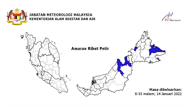 PETALING JAYA, 15 Januari – Jabatan Meteorologi Malaysia (MetMalaysia) mengeluarkan amaran hujan berterusan tahap waspada yang dijangka berlaku di Sarawak dan Sabah.