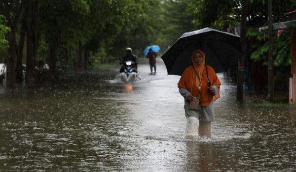 (Seorang wanita meredah air yang melimpahi jalan ekoran hujan lebat