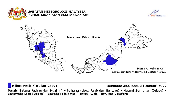 PETALING JAYA, 31 Januari – Jabatan Meteorologi mengeluarkan amaran ribut petir, hujan lebat dan angin kencang yang dijangka berlaku di negeri Perak (Batang Padang dan Muallim), Pahang (Lipis, Raub dan Bentong, Negeri Sembilan (Jelebu), Sarawak: Kapit (Belaga), Sabah: Pedalaman (Tenom, Kuala Penyu dan Beaufort) hingga 3 pagi ini.