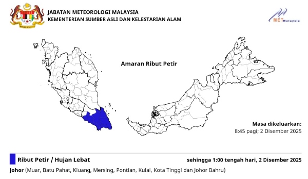 KUALA LUMPUR, 2 Disember – MetMalaysia mengeluarkan amaran ribut petir, hujan lebat dan angin kencang di dua negeri di seluruh Melaka dan Johor hingga pukul 2 petang ini.