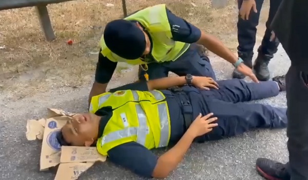 KUALA LUMPUR, 17 September- Anggota penguat kuasa Jabatan Pengangkutan Jalan (JPJ) cedera selepas dirempuh seorang penunggang motosikal dalam operasi sekatan jalan raya (SJR) di kilometer 28 Lebuhraya Seremban Port Dickson (SPHD) Hala Portd Dickson.