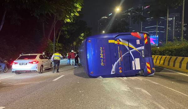 Dalam kejadian tengah malam tadi, bas ekspres dua tingkat itu terbabas sebelum terbalik di susur Jalan Damansara menuju Bangsar, di sini.-BERNAMA
