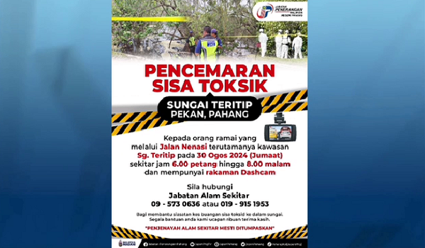 “Sekiranya penduduk mengalami gejala gatal-gatal kulit, mata berair, sesak nafas dan loya serta pening kepala, mereka dinasihat untuk hadir atau menghubungi Klinik Kesihatan Nenasi segera. Siasatan bagi mengesan penjenayah alam sekitar ini sedang giat dijalankan,” katanya.