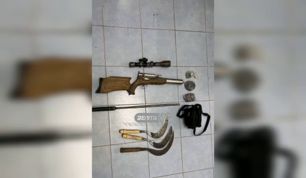 Pemeriksaan beg berjaya menjumpai selaras senapang angin yang dileraikan kepada lima bahagian bersama tiga bungkus peluru timah buatan sendiri dan tiga bilah sabit.