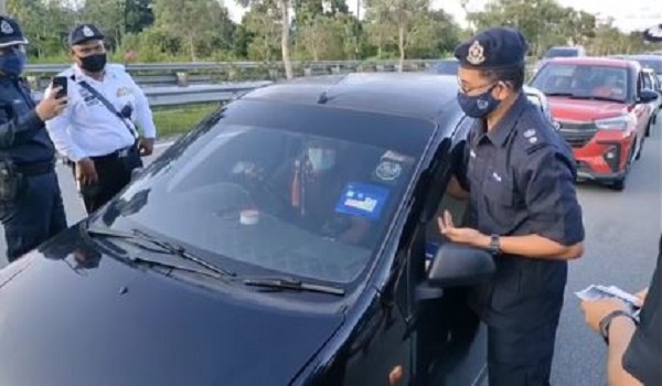 (Kamarulzaman (kanan) memasang pelekat kempen Op Selamat kepada kereta pengguna jalan raya semasa melancarkan Pra Op Selamat tahun 2022 Kontinjen Pahang di Jambatan Sultan Abu Bakar.