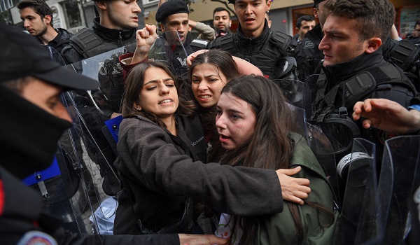 Polis rusuhan Turki menahan berpuluh-puluh penunjuk perasaan di Istanbul, menekan sebahagian daripada mereka ke tanah dan mengheret mereka keluar dari perhimpunan itu, yang menurut pejabat gabenor tidak mendapat kebenaran.