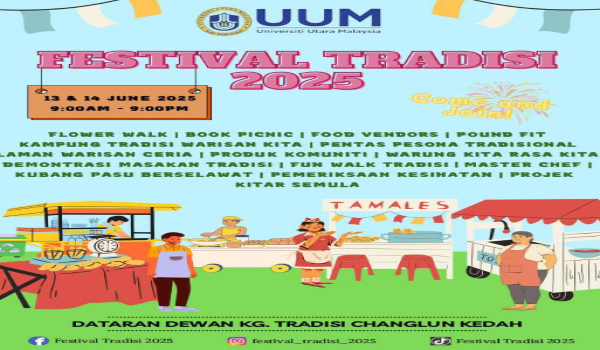 “Penganjuran pertama festival melibatkan kerjasama UUM dan komuniti pada 13-14 Jun lalu di Dataran Kampung Tradisi. Kita dapati, Festival Tradisi mampu memacu pembangunan sosioekonomi masyarakat Changloon melalui penganjuran acara berasaskan komuniti,”katanya.