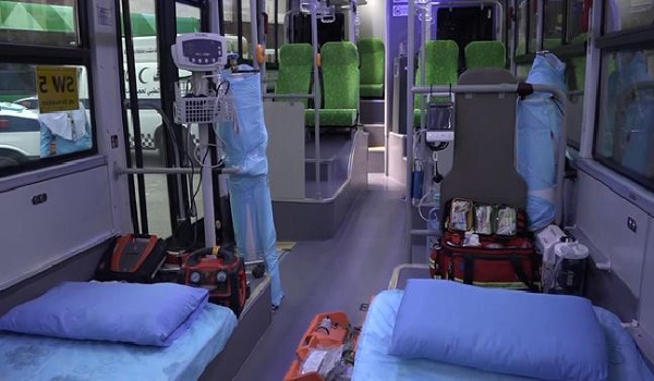 Bas tersebut telaş diubahsuai dengan meletakkan tilam, bagi membolehkan pesakit yang tertentu, berbaring selain peralatan perubatan.