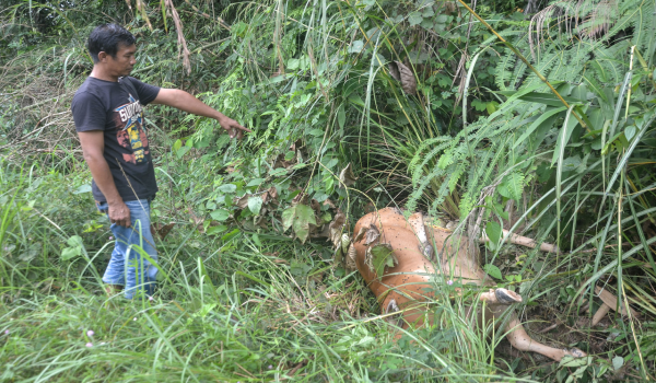 “Lembu ini bunting. Kecederaan di leher dan dimakan. selama ini ada kesan tapak kaki tetapi atas bukit. Cuma kita takut sekiranya Jabatan Perlindungan Hidupan Liar dan Taman Negara (Perhilitan) tidak bertindak semakin banyak lembu mati,” katanya.