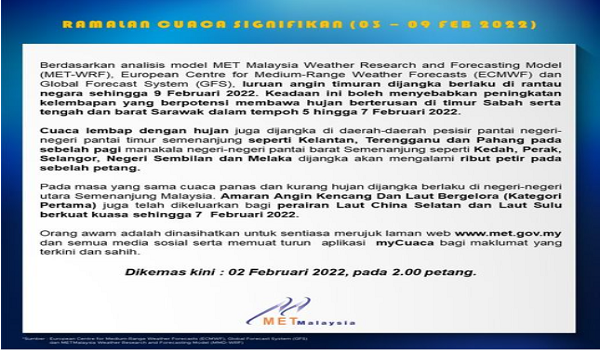 Ini susulan analisis kaji cuaca dikeluarkan oleh MetMalaysia bersama Pusat Ramalan Cuaca Julat Sederhana Eropah (ECMWF) dan Sistem Ramalan Global (GFS) yang menunjukkan luruan angin timuran di rantau negara hingga 9 Februari ini.