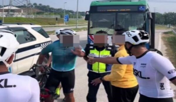 Menerusi rakaman yang dimuat naik oleh seorang penunggang basikal, bas tersebut dilihat memandu berhampiran kumpulan terbabit sebelum berhenti dan berlaku perselisihan faham.