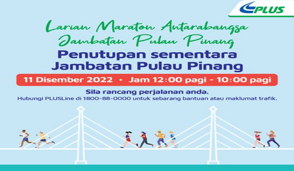 GEORGE TOWN, 7 Disember- PLUS Malaysia Bhd (PLUS) memaklumkan Jambatan Pulau Pinang akan ditutup sementara sempena acara larian Maraton Antarabangsa Jambatan Pulau Pinang (PBIM) pada Ahad ini bermula pukul 12.00 tengah malam sehingga 10.00 pagi.