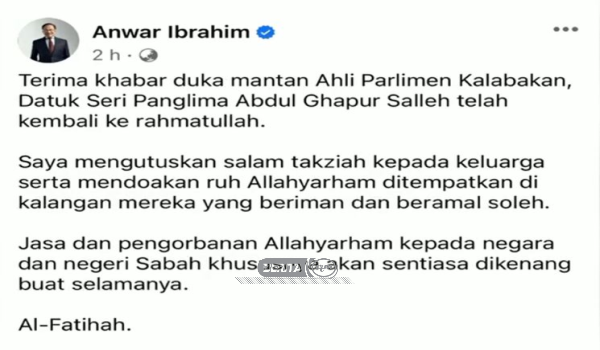 Sementara itu, Perdana Menteri menerusi Facebooknya, mengucapkan takziah kepada keluarga Allahyarham Datuk Seri Abdul Ghapur Salleh.