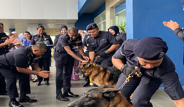 JOHOR BAHRU, 26 Januari- Seekor anjing dari Unit K9, Ibu Pejabat Polis Kontinjen (IPK) Johor dianugerahkan Pingat Penghargaan Ketua Polis Johor, atas kejayaan mengesan peranti rakaman kamera litar tertutup (CCTV) yang dibawa lari penjenayah di Kulai pada tahun lepas.