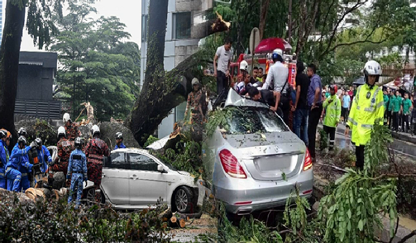 Dalam kejadian kira-kira 2 petang semalam, seorang lelaki tempatan maut manakala dua lagi cedera selepas sebatang pokok tumbang menghempap 17 kenderaan dan landasan Monorel akibat hujan lebat serta angin kuat di Jalan Sultan Ismail.