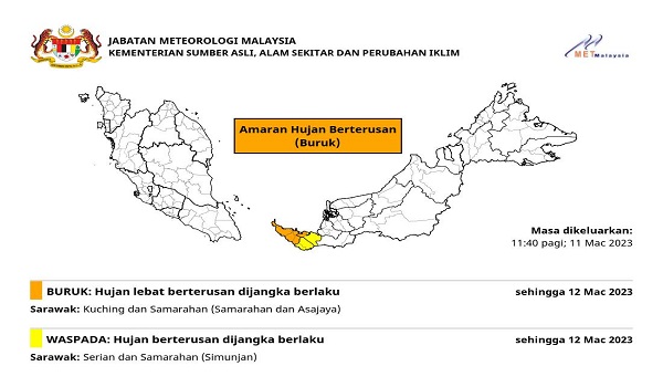 KUALA LUMPUR, 11 Mac- Jabatan Meteorologi Malaysia (MetMalaysia) mengeluarkan amaran hujan berterusan tahap buruk di Sarawak hingga esok.